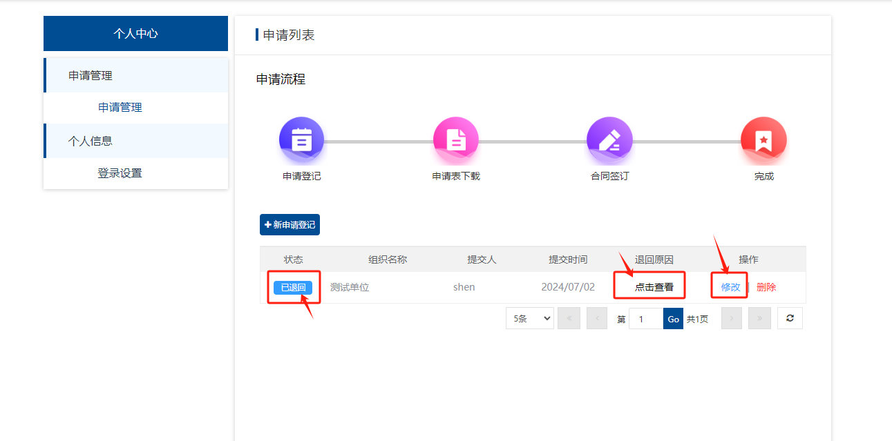申请记录列表:申请者已填写、已提交申请信息展示,申请者可在申请入口多次提交申请。